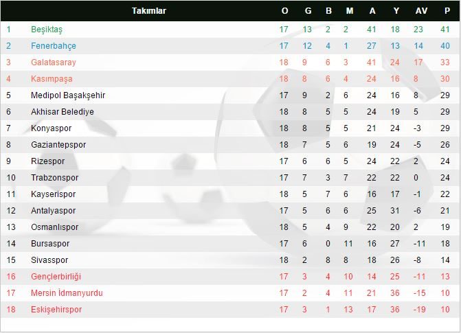 Süper Lig 18. haftada dün oynanan maçlarda ise Medipol Başakşehir, Antalyaspor'u 2 - 1 ve Gençlerbirliği de Çaykur Rizespor'u yine deplasmanda 3 - 2 mağlup etti. Günün diğer maçında ise Bursaspor yeni stadında konuk ettiği Trabzonspor karşısında 2 - 0 geriye düşmesine rağmen sahadan 4 - 2 galip ayrıldı.