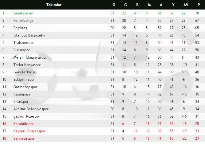 Süper Lig'de 31. hafta maçları bir maç dışında tamamlandı.Galatasaray, zorlu deplasmanda bir gol 3 puan ile liderliğini sürdürürken, Fenerbahçe dün oynanan maçta kendi sahasında Kayseri Erciyesspor ile 1-1 berabere kalarak şampiyonluk şansını zora soktu. Galatasaray ile Fenerbahçe arasındaki puan farkı böylece 4'e çıktı.