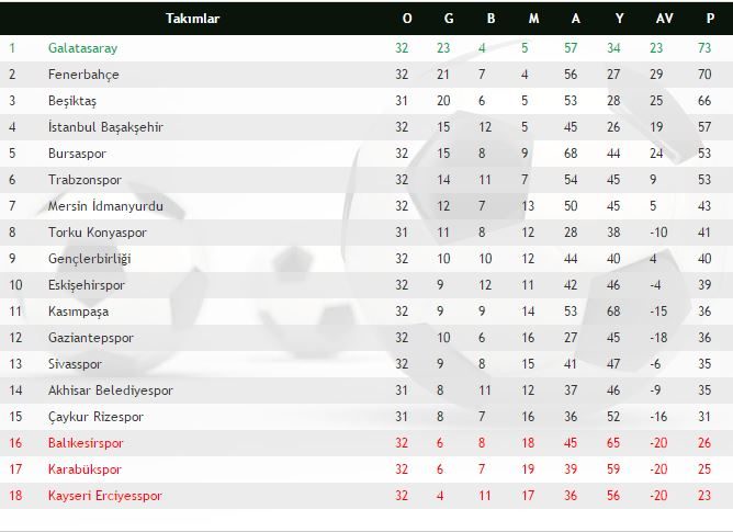 Süper Lig'de 32. hafta maçları 2 maç dışında tamamlandı. Süper Lig 2014-2015 sezonunda lider Galatasaray rakibi Gençlerbirliği'ni 1-0 yenerek liderliğini korudu. Şampiyonluk yarışında kalan son 2 haftada neler olacak? Süper Lig puan durumu nasıl oldu? Spor Toto Süper Lig'in 32. haftasında Mersin İdmanyurdu'nu 1-0 yenen Fenerbahçe, lider Galatasaray'ı 3 puan geriden takibini sürdürdü.