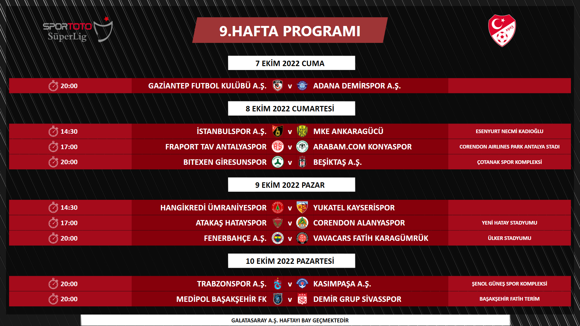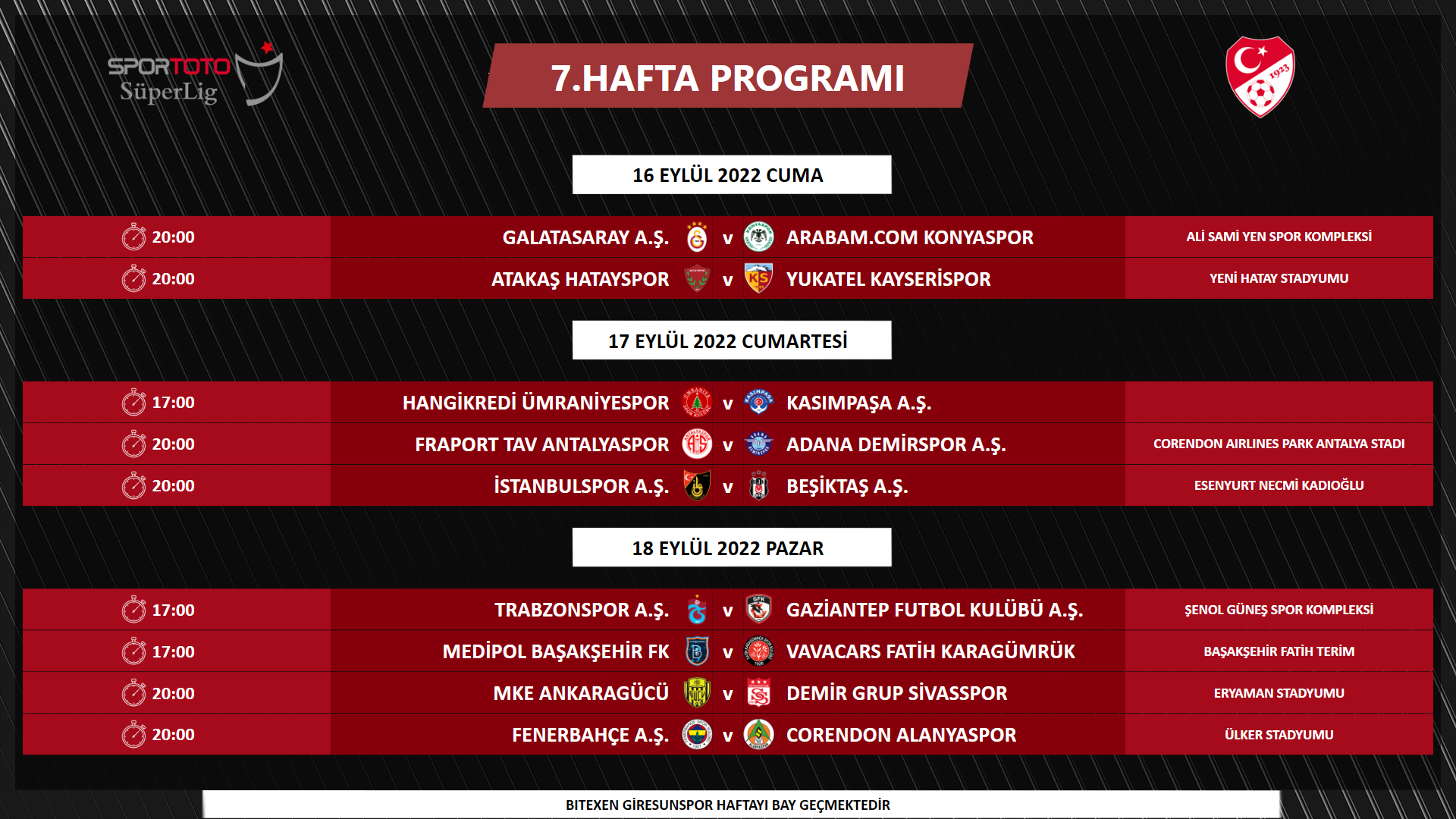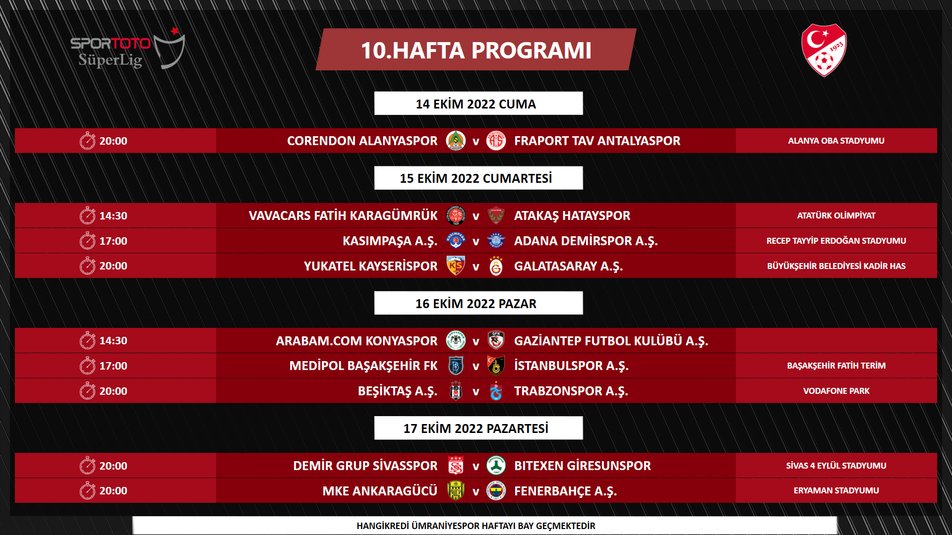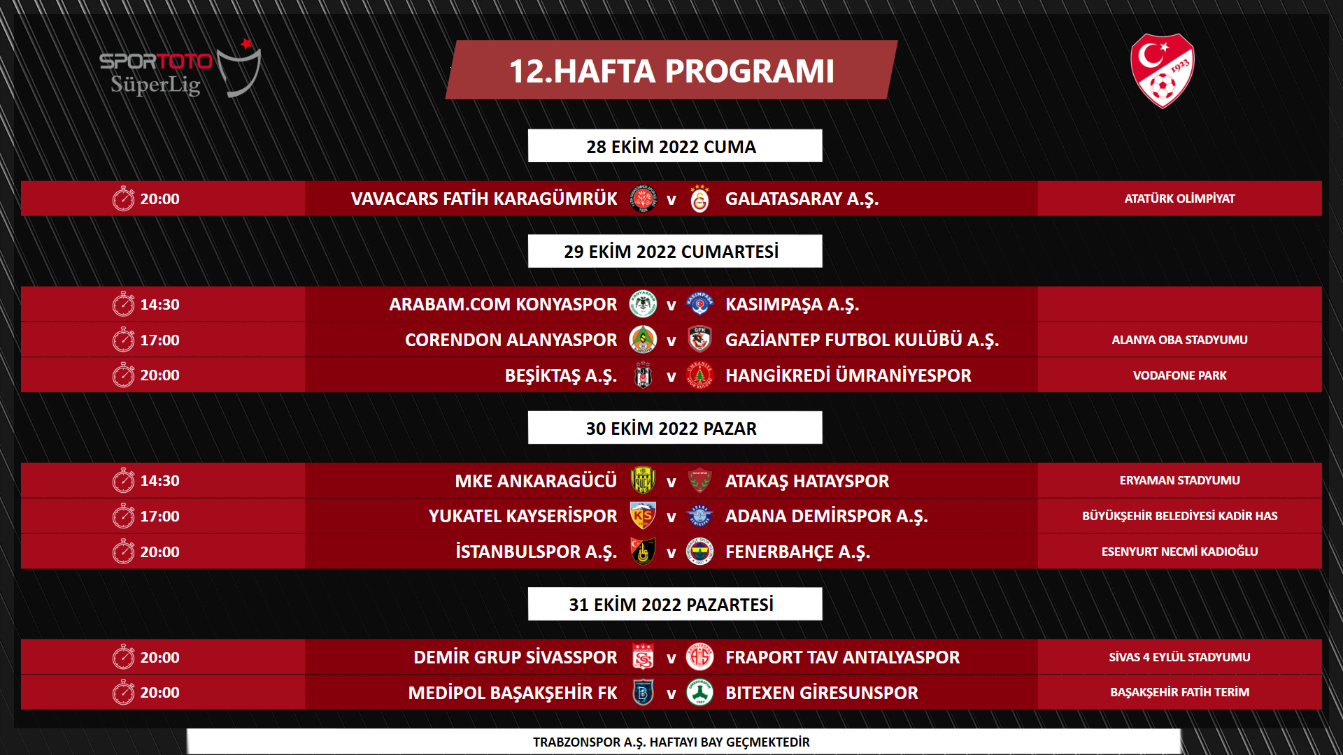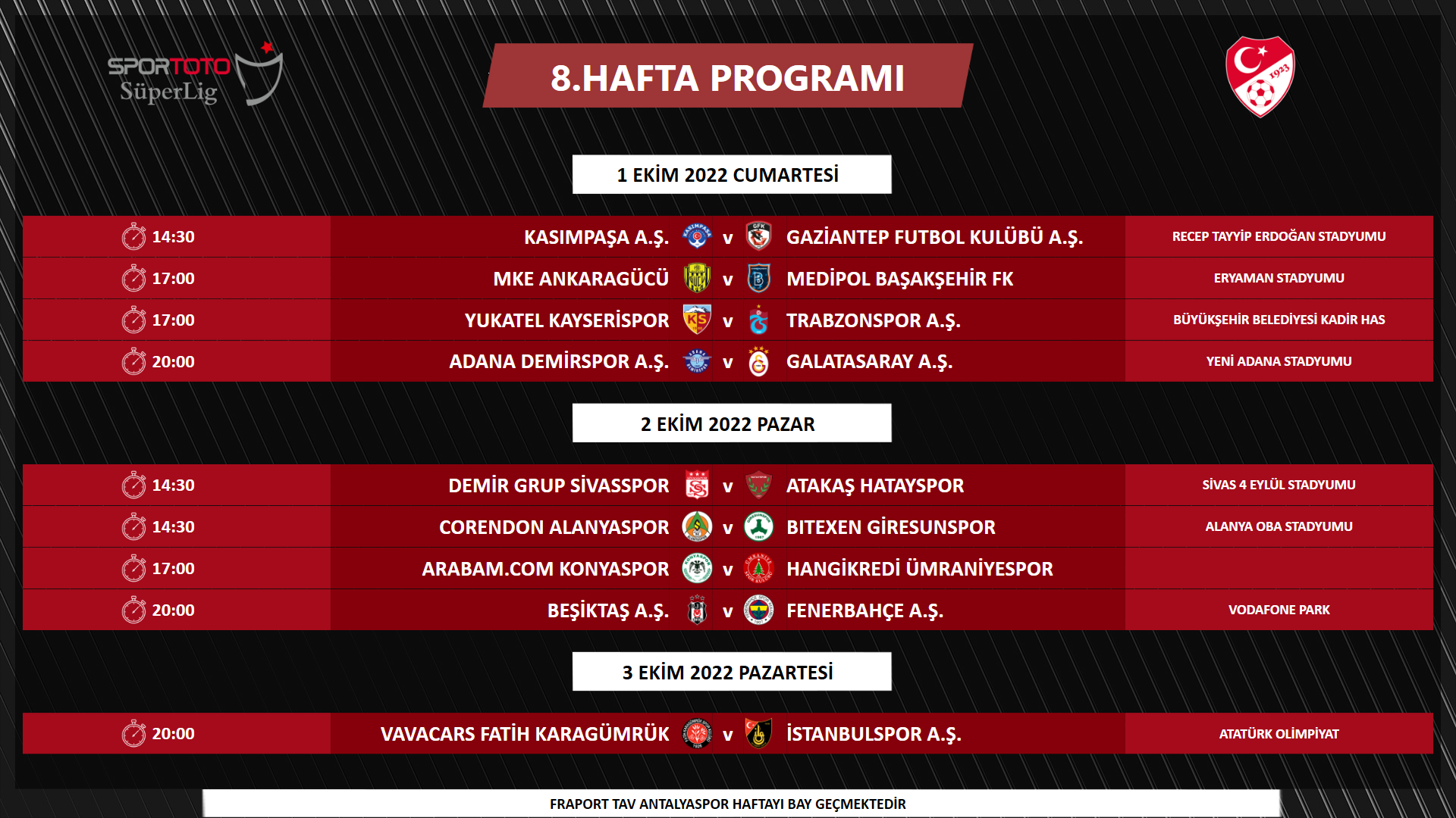 - 20:00 | Beşiktaş-Trabzonspor: 16 Ekim