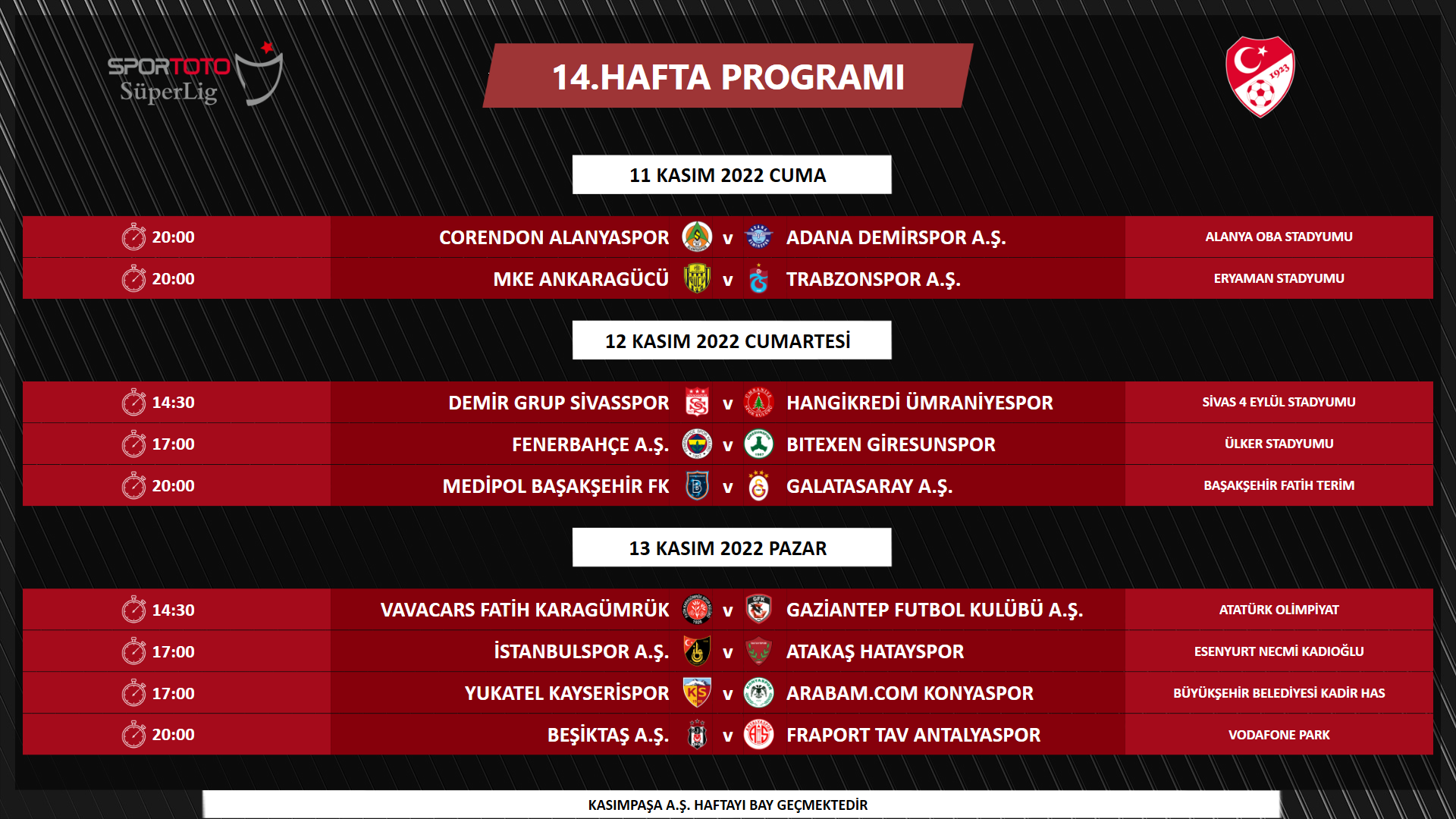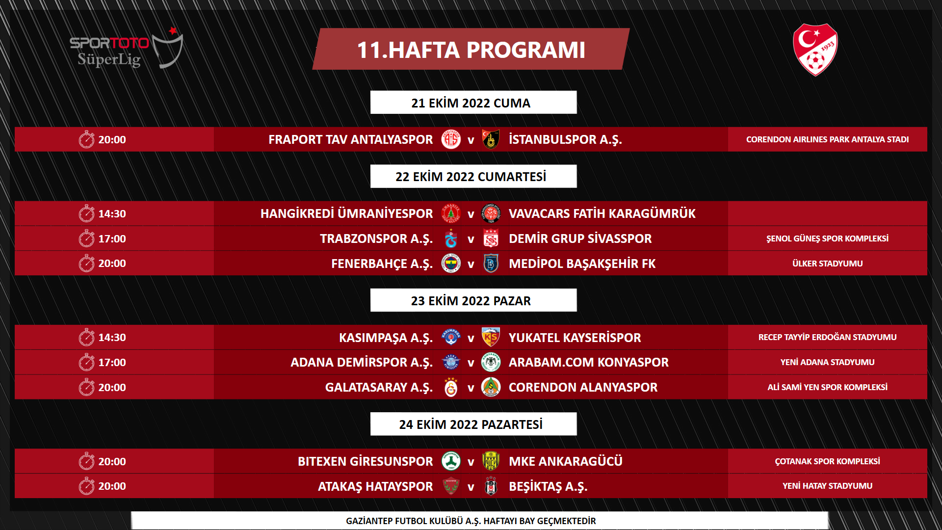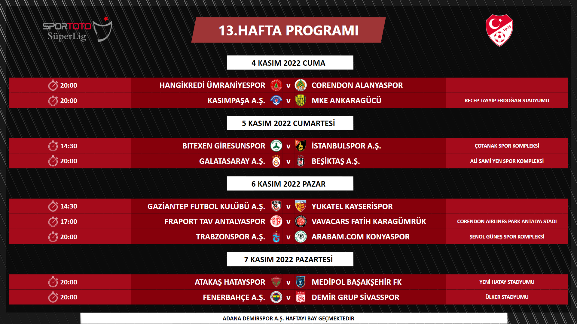 - 20:00 | Galatasaray-Beşiktaş: 5 Kasım