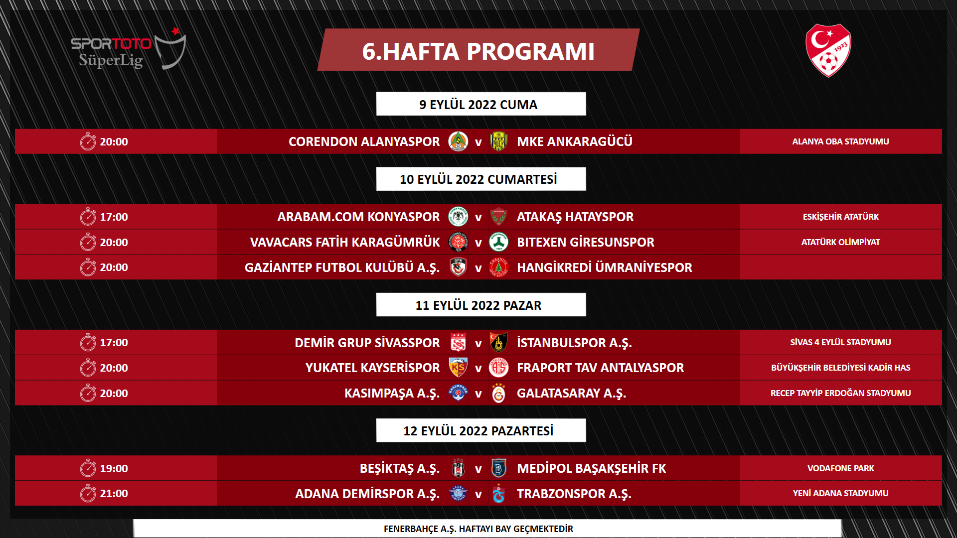 Spor Toto Süper Lig'de 6-14. hafta müsabaka programı açıklanırken, Dünya Kupası arasına kadar oynanacak derbilerin tarihleri de belli oldu. Türkiye Futbol Federasyonu, 21:45'te başladığı için geç saatte biten lig maçlarıyla ilgili de yeni bir karar aldı.