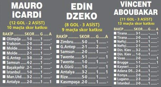 İki kulvarda takımlarının en skorer isimleri olan bu oyunculardan Arjantinli olanı 10 maçta 14, Kamerunlu 13 maçta 14, Bosnalı ise 9 maçta 11 kez skora katkı yaptı.