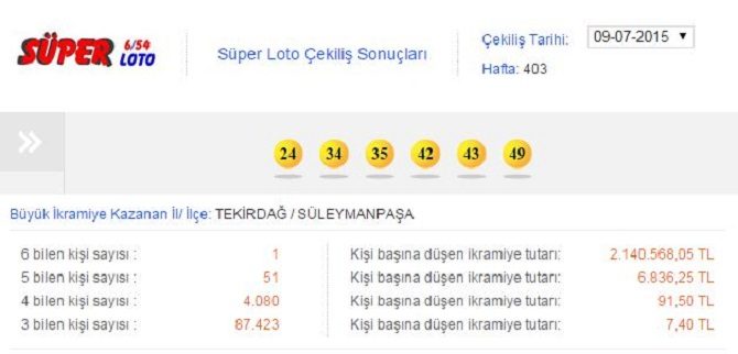 Süper Loto çekildi. Heyecanla ve merakla beklenen Süper Loto 9 Temmuz çekilişi yapıldı. Süper Loto 403. hafta çekilişinde bir kişiye 2 milyon lira kazandıran numaraların hepsi çift haneli çıktı. Süper Loto çekilişinde altı bilen bir şanslı kişi 2 milyon 140 bin 568 lira 5 kuruş kazandı. Geçen hafta devrettiği için katılımın arttığı ve ikramiye kazanan kişi sayısında artış gözlendiği 08.07.2015 tarihli Süper Loto çekilişi sonuçları, kazandıran sayıları ve ikramiye miktarları haberimizde...