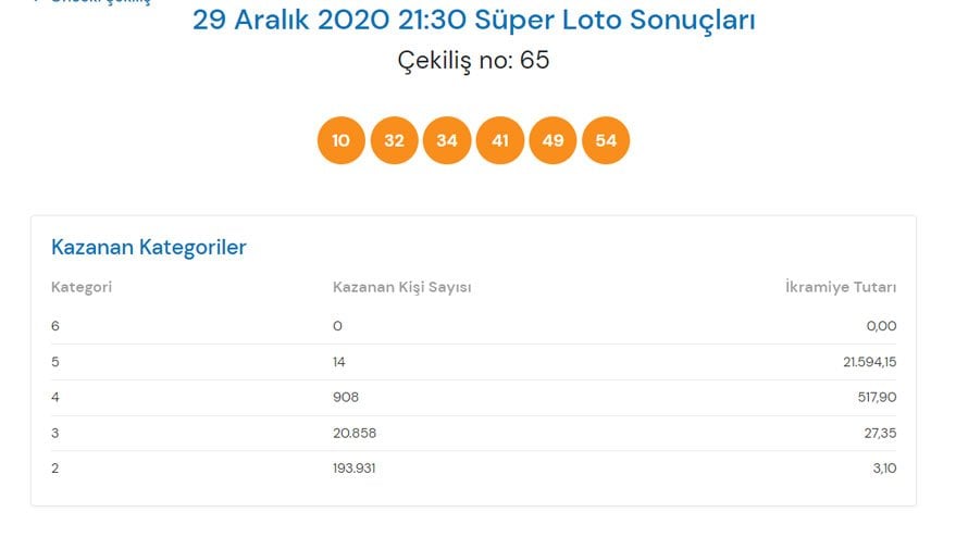 Süper Loto'nun 29 Aralık tarihli çekiliş sonuçlarına göre şanslı rakamlar şu şekilde oldu; “10-32-34-41-49-54”