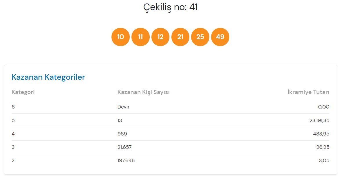Süper Loto’nun 3 Kasım 2020 tarihli 41. çekiliş sonuçları şu şekilde; 10 – 11 – 12 – 21 – 25 – 49