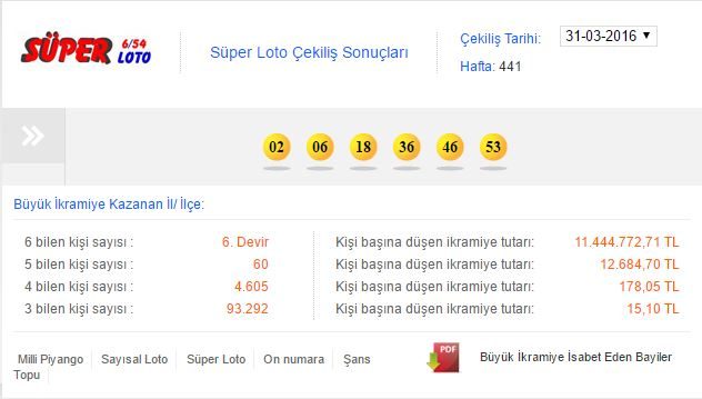 Milli Piyango İdaresi tarafından yapılan Süper Loto çekilişinde 5 bilen 60 kişi 10 bin 356 lira 45'er kuruş, 4 bilen 3 bin 904 kişi 171 lira 20'şer kuruş, 3 bilen 78 bin 323 kişi 14 lira 70'şer kuruş ikramiye kazandılar.