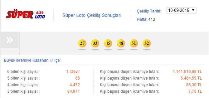 Milli Piyango İdaresinden yapılan açıklamaya göre, bu haftaki Süper Loto çekilişinde 5 bilen 65 kişi 5 bin 464 lira 55'er kuruş, 4 bilen 4 bin 472 kişi 85 lira 30'ar kuruş, 3 bilen 84 bin 971 kişi 7 lira 75'şer kuruş ikramiye alacak.