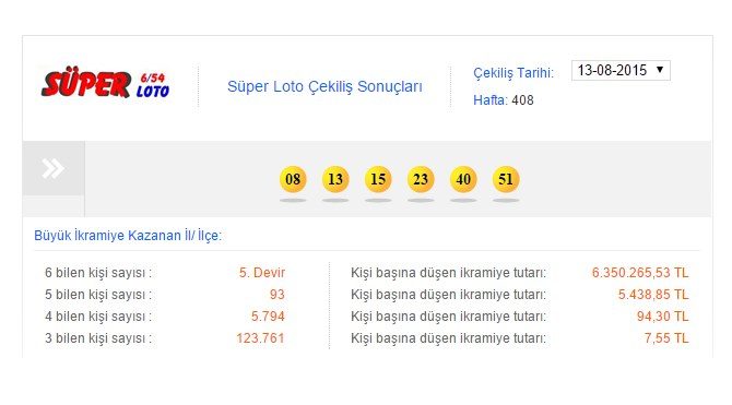 13 Ağustos Süper Loto çekilişi sonucunda 408. haftanın kazandıran numaraları 8, 13, 15, 23, 40 ve 51 olarak belirlendi.