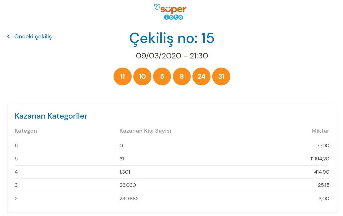 Süper Loto’nun 15. çekilişinde şanslı rakamlar; 5-8-10-11-24-31 olarak belirlendi.