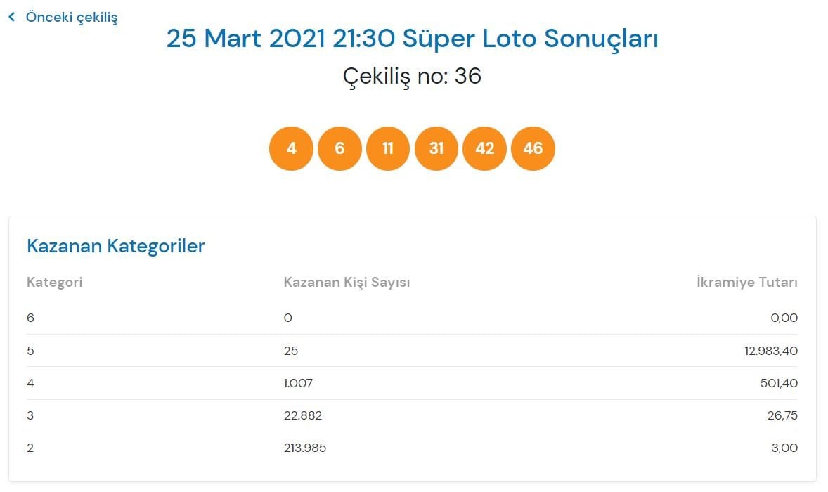 Süper Loto'nun 25 Mart tarihli 36. çekiliş sonuçları: 4-6-11-31-42-46