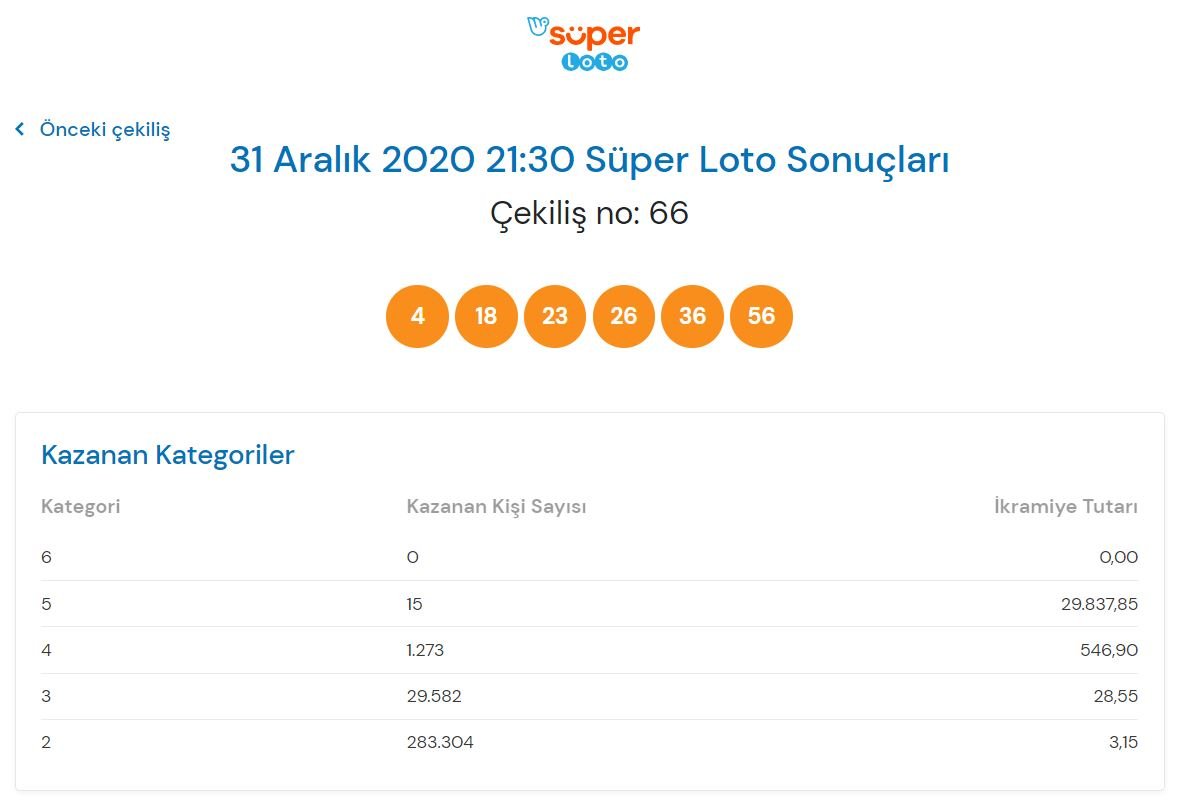 Süper Loto'nun 31 Aralık tarihli 66. çekiliş sonuçları şu şekilde: 4-18-23-26-36-56