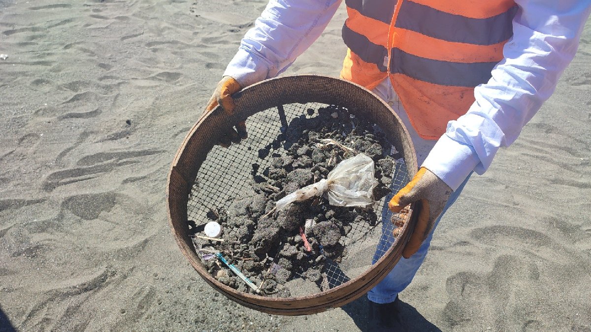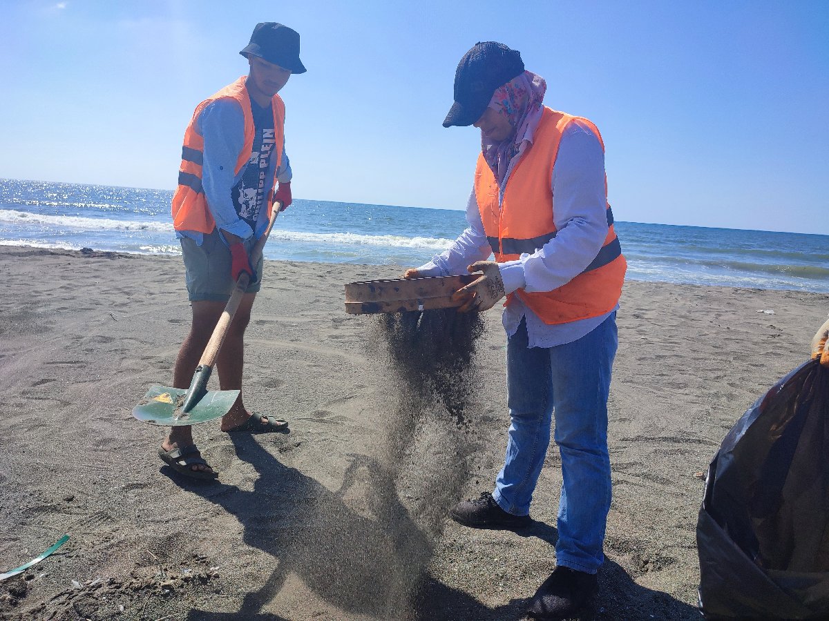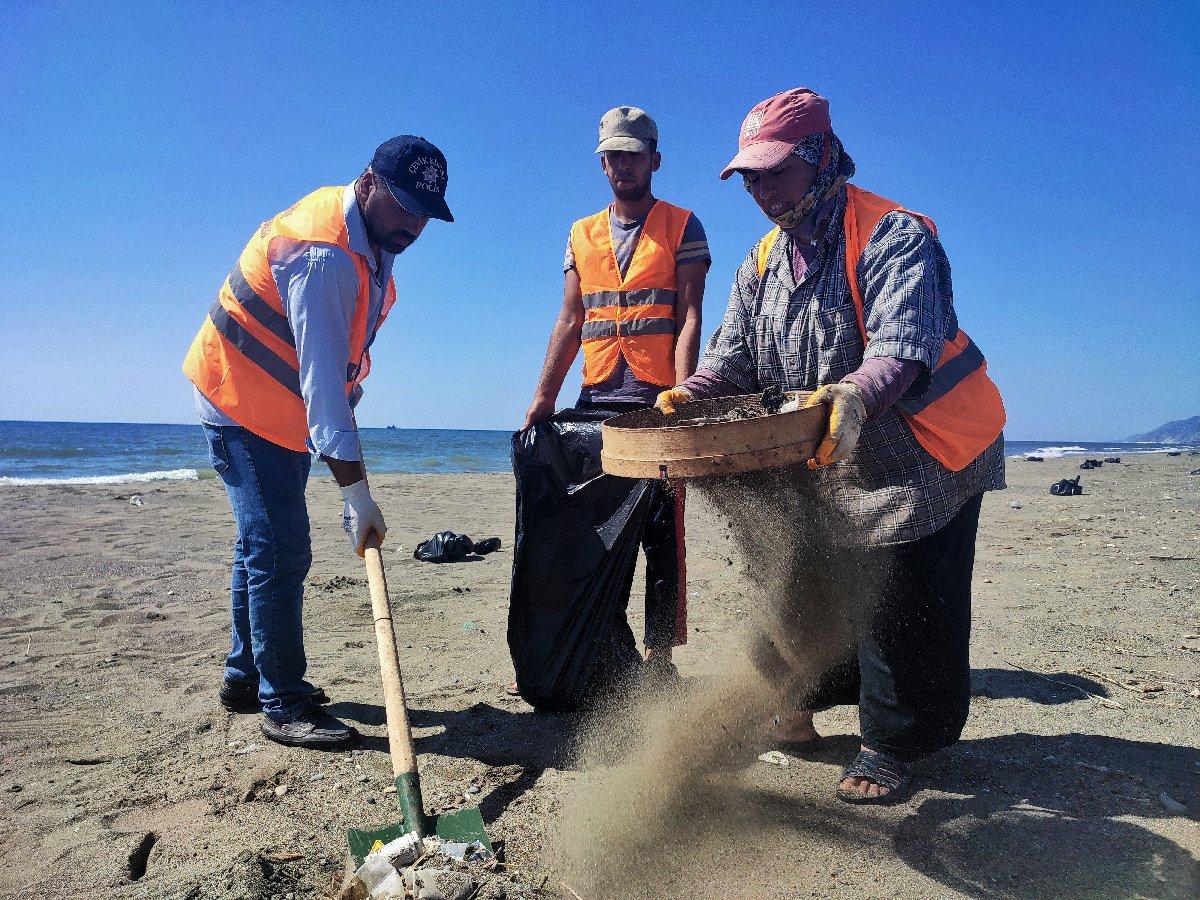 Çevre ve Şehircilik İl Müdürlüğü ekipleri, 2 Eylül'de başlayan temizlik çalışmalarını sürdürüyor. Ekipler, tırpan ve kürek kullanarak kumsaldan topladıkları atıkların kumlarını eleyip çuvallara dolduruyor.