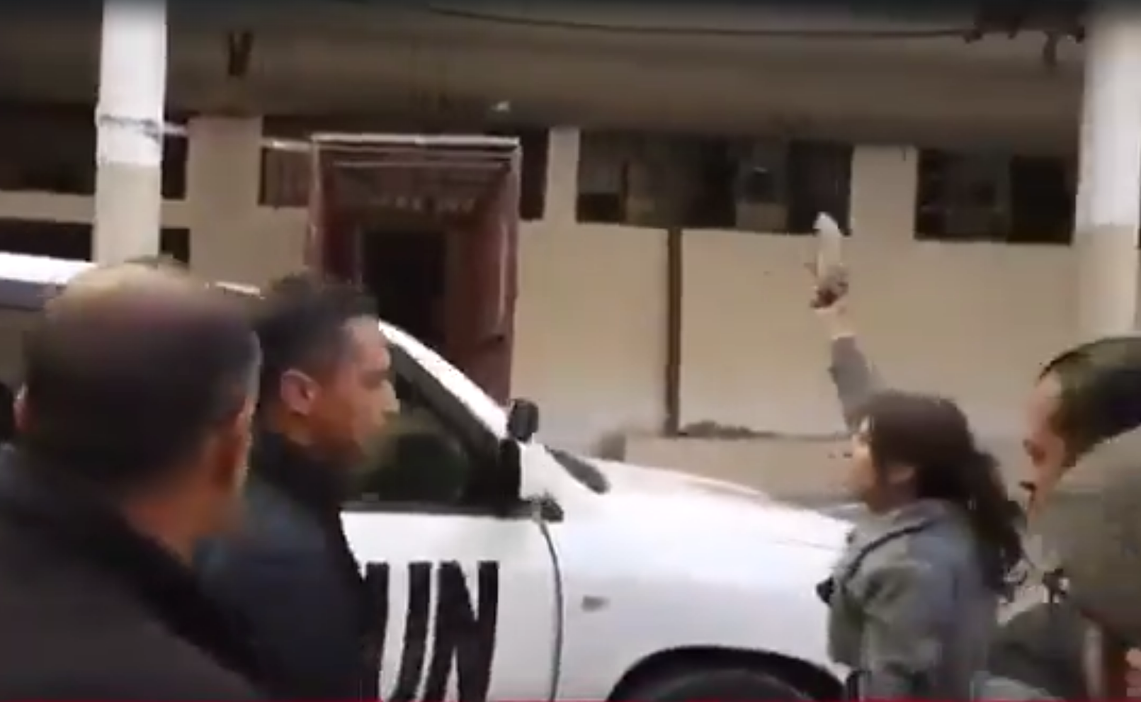 Birleşmiş Milletler'in Suriye konusundaki eylemsizliğini eleştiren kadın, ayakkabısını çıkartarak sallamaya başladı. Pedersen 'BM' logolu arabasına sığınırken kadın, ayakkabılarını Pedersen'ın sığındığı arabaya fırlattı.