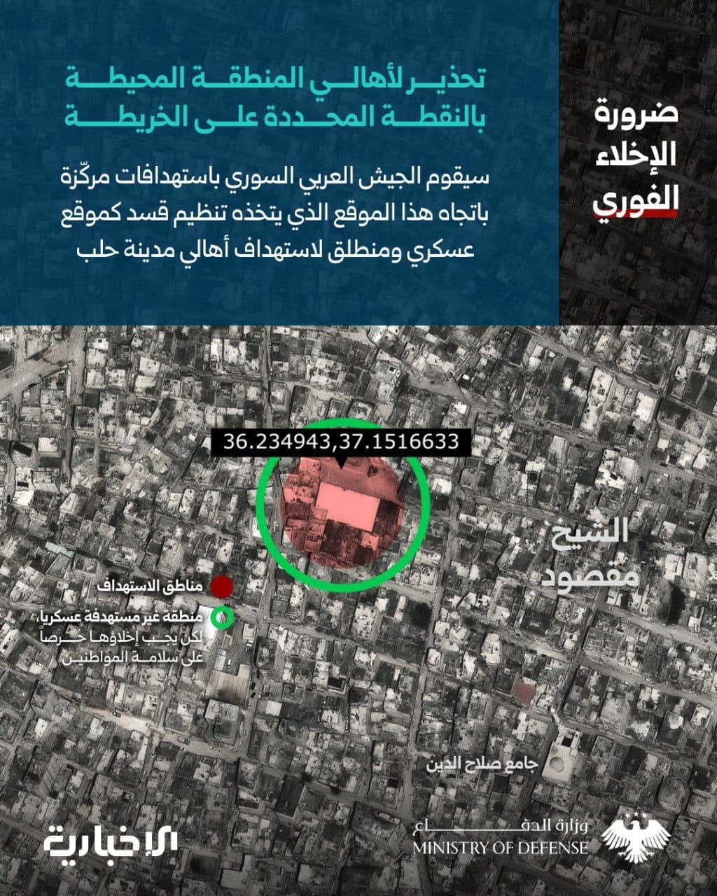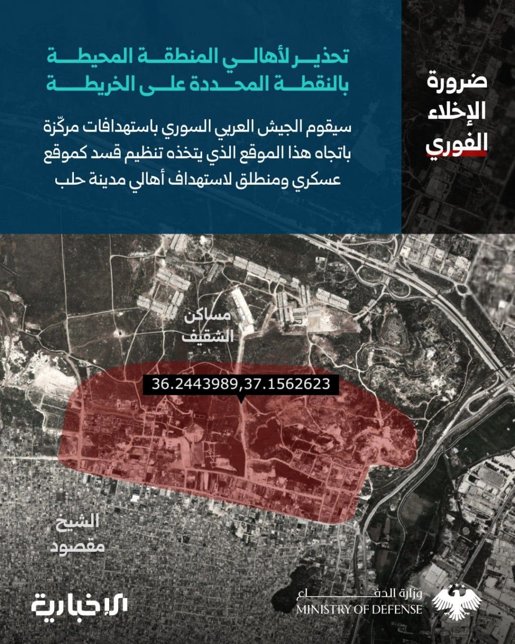 Suriye ordusunun açıklamasında "İnsani yardım koridoru saat 16:00 ile 18:00 arasında açık olacak. Şeyh Maksud mahallesindeki halkımızı, El-Awarid koridoru üzerinden Halep şehrinin diğer mahallelerine hızla gitmeye çağırıyoruz. Ayrıca SDG'ye silahlarını bırakmaları çağrısında bulunuyoruz ve güvenliklerini sağlamak için çalışacağız" ifadeleri kullanıldı.