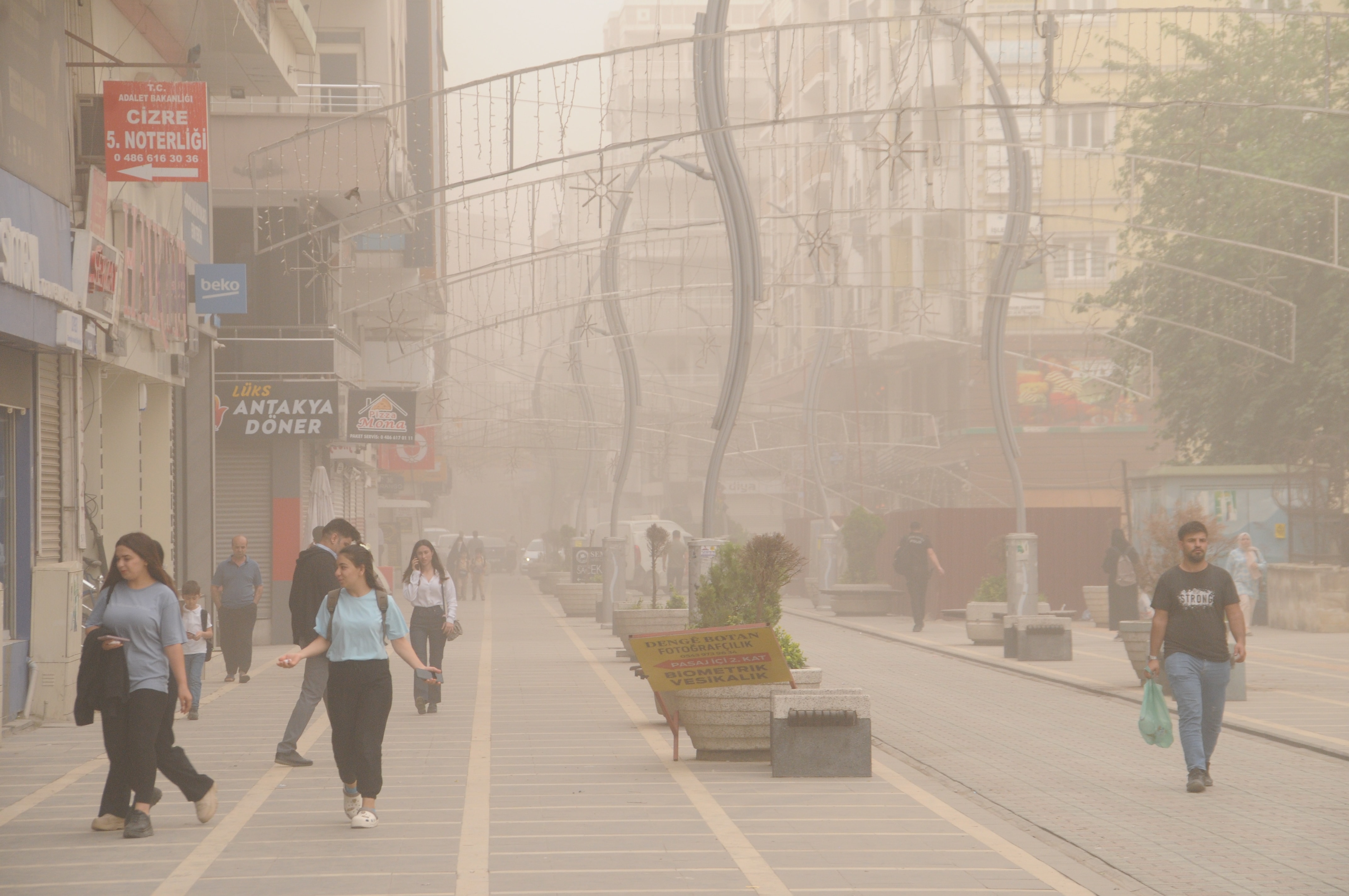 Cizre ilçesinde bazı vatandaşlar, toz taşınımından etkilenmemek için maske taktı.