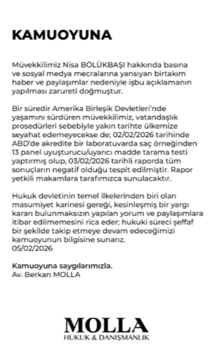 Bölükbaşı'nın avukatı Berkan Molla, "Müvekkilimiz Nisa Bölükbaşı hakkında basına ve sosyal medya mecralarına yansıyan birtakım haber ve paylaşımlar nedeniyle işbu açıklamanın yapılması zarureti doğmuştur. Bir süredir Amerika Birleşik Devletleri'nde yaşamını sürdüren müvekkilimiz, vatandaşlık prosedürleri sebebiyle yakın tarihte ülkemize seyahat edemeyecekse de; 02/02/2026 tarihinde ABD'de akredite bir laboratuvarda saç örneğinden 13 panel uyuşturucu/uyarıcı madde tarama testi yaptırmış olup, 03/02/2026 tarihli raporda tüm sonuçların negatif olduğu tespit edilmiştir. Rapor yetkili makamlara tarafımızca sunulacaktır." açıklamasını yaptı.