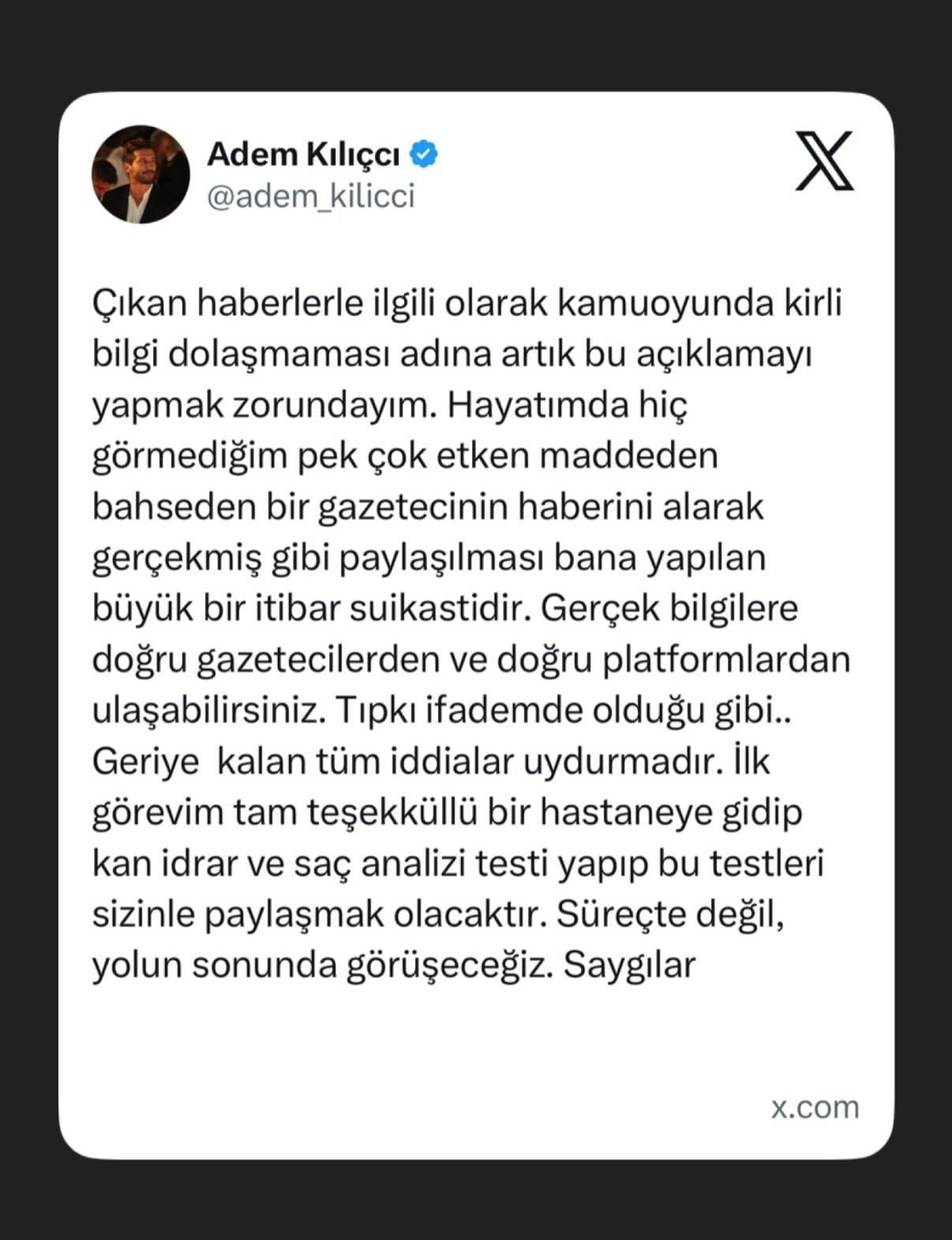 Ayrıca açıklamasında, “Kamuoyunda yanlış bilgilerin yayılmaması için bu açıklamayı yapmak zorundayım. Hayatımda hiç görmediğim bazı maddelerle ilgili iddialar ortaya atıldı ve bunlar gerçekmiş gibi yayıldı. Tam teşekküllü bir hastanede yapılacak testlerin sonuçlarını kamuoyuyla paylaşacağım. Sürecin sonunda yeniden konuşacağız” ifadelerine yer verdi.