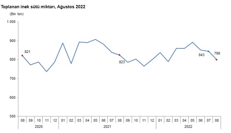 2022 Ocak-Ağustos döneminde ise bir önceki yılın aynı dönemine göre, tereyağı üretimi yüzde 26,9, ayran üretimi yüzde 13,9, yoğurt üretimi yüzde 3,6 artarken; inek peyniri üretimi yüzde 5,5 ve içme sütü üretimi yüzde 1 azaldı.