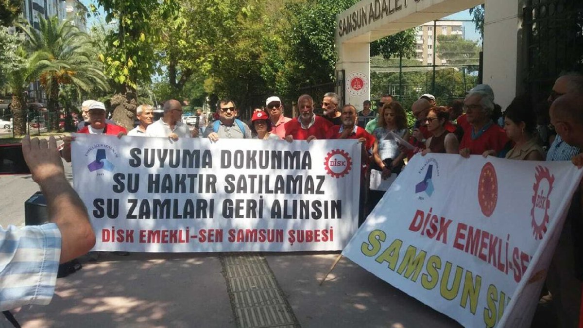 DİSK Emekli-Sen Samsun Şubesi üyeleri, Samsun Büyükşehir Belediye Başkanı Mustafa Demir hakkında idare mahkemesinin suya yapılan zammın yürütmesinin durdurulması kararını uygulamadığı gerekçesiyle suç duyurusunda bulundu. Samsun Adliyesi önünde açıklama yapan DİSK Emekli-Sen Samsun Şube Başkanı Arif Kutlu, şunları söyledi: