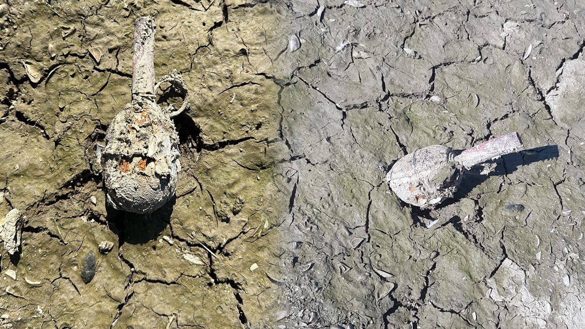 Adana'da suyun çekildiği Seyhan Baraj Gölü'nde bulunan el bombası polis tarafından imha edildi.