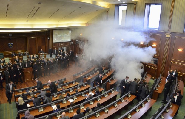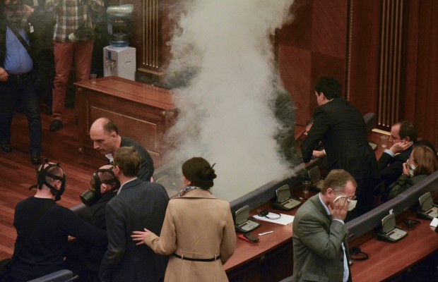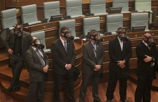 Muhalefet vekillerinin, Cumhurbaşkanının seçildiği meclis genel kurulunda biber gazı atması nedeniyle, güvenlik görevlileri gaz maskesi taktı. (Foto: Reuters)PDK sempatizanları Taçi'nin Cumhurbaşkanlığı görevine seçilmesi üzerine Priştine meydanlarına kutlamalar yaptı.