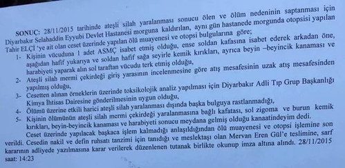 Diyarbakır’ın merkez Sur ilçesinde yaptığı basın açıklaması sonrasında çıkan çatışmada hayatını kaybeden Diyarbakır Baro Başkanı Tahir Elçi’nin otopsi raporu tamamlandı. Elçi’nin otopsi raporunda şu bilgilere yer verildi: “28.11.2015 tarihinde ateşli silah yaralaması sonucu ölen ve ölüm nedeninin saptanması için Diyarbakır Selahattin Eyyubi Devlet Hastanesi morguna kaldırılan, aynı gün hastanede morgunda otopsisi yapılan Tahir Elçi’ye ait olan ceset üzerinde yapılan ölü muayenesi ve otopsi bulgularına göre;