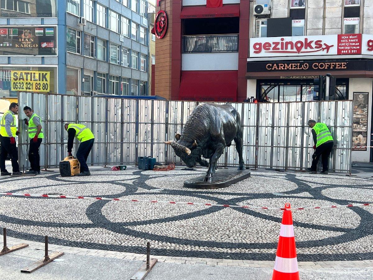 Yaşanan olay sonrası sabah saatlerinde olay yerine gelen ekipler, Boğa Heykeli çevresini bariyerle kapatarak yenileme çalışmalarına başladı.
