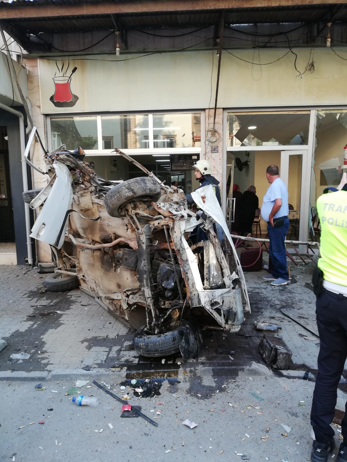 Kaza, Yenice Mahallesi, Kasımefendi Caddesi'nde meydana geldi. Mensur Uğur yönetimindeki 16 R 9483 plakalı otomobil, sürücüsünün kontrolünden çıkıp yol kenarındaki ağaca çarptıktan sonra taklalar atarak kıraathaneye çarptı. Kazada, otomobil sürücüsü Mensur Uğur ile kıraathanede çaycılık yapan Ersin Suvat (24) yaralandı.