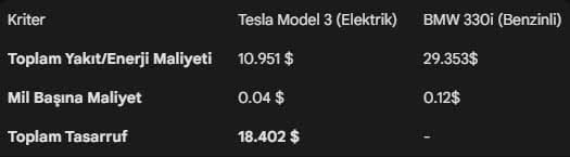 Veriler, elektrikli araçların işletme maliyetindeki ezici üstünlüğünü ortaya koyuyor. Amerika Birleşik Devletleri verileriyle yapılan karşılaştırmalı analizde tablo şöyle: