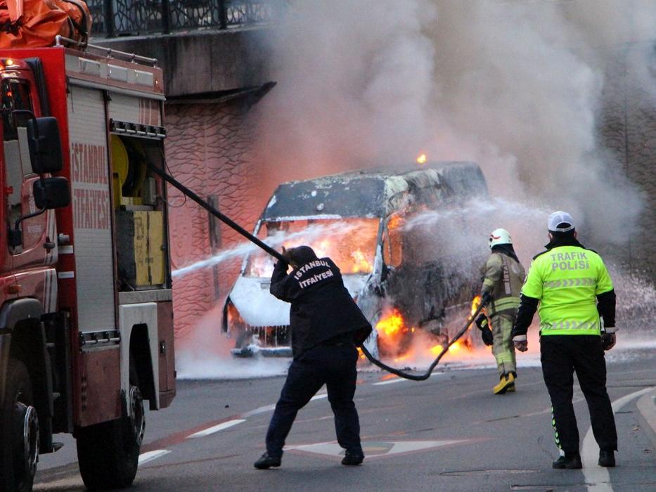 Yangın söndürme tüpüyle yangına müdahale etse de başarılı olamadı. Zaman zaman patlamaların olduğu servis minibüsü alev topuna döndü. Vatandaşların ihbarıyla olay yerine Beyoğlu itfaiye ekibi sevk edildi.