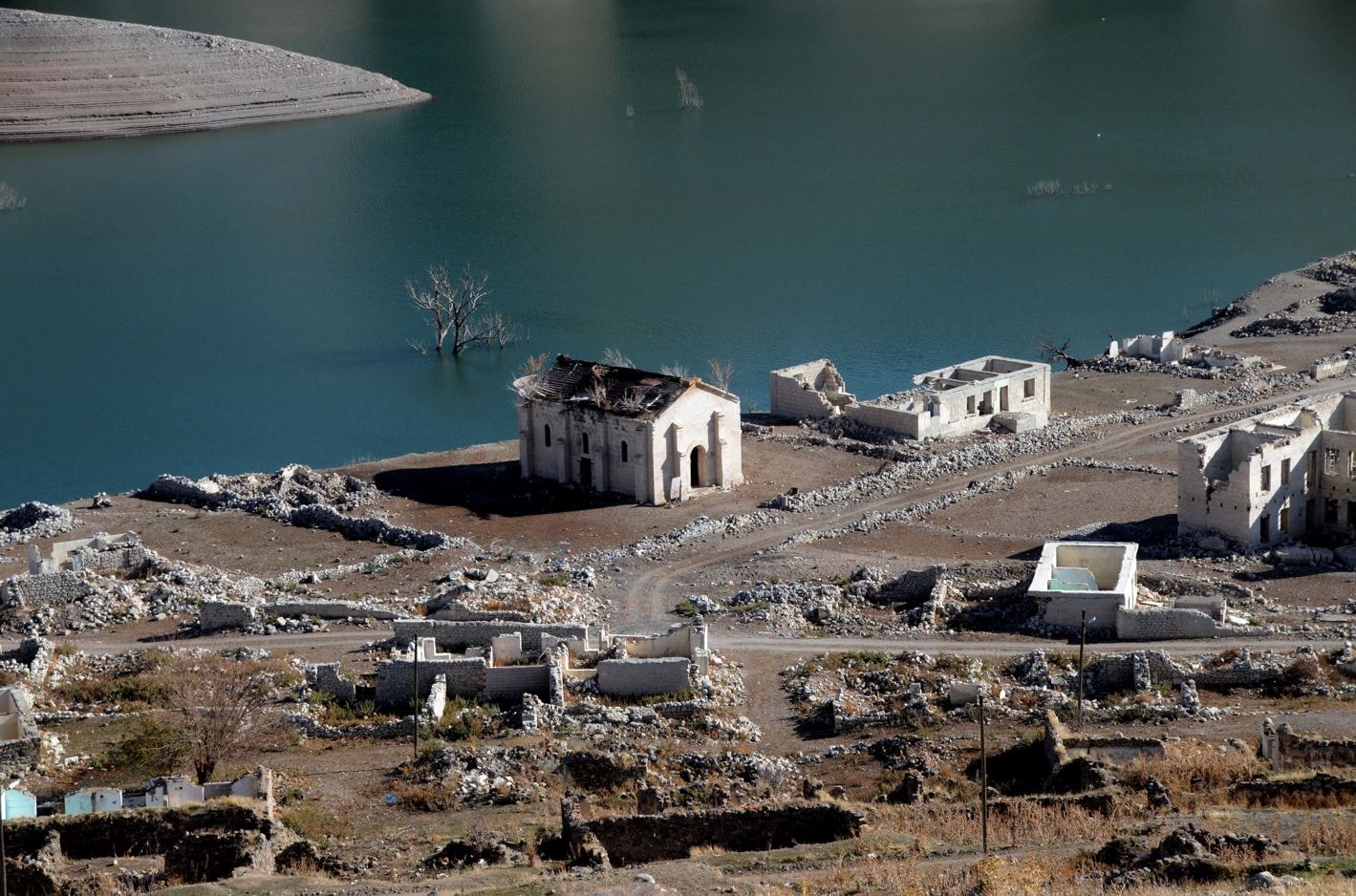 Baraj kapaklarının kısmen açılmasıyla su seviyesi düşünce köydeki evler, cami, kilise ve bazı tarihi binalar gün yüzüne çıktı.