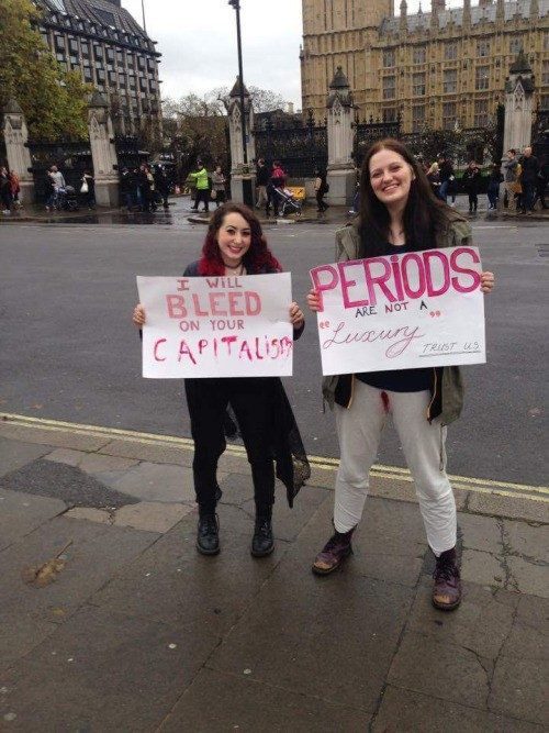 Tampon'nun bir lüks değil ihtiyaç olduğunu iddia eden ve tampon vergisini protesto eden kadın göstericiler, adet dönemlerinde tampon takmadan beyaz pantolon giyerek Westminster'da gösteri düzenledi