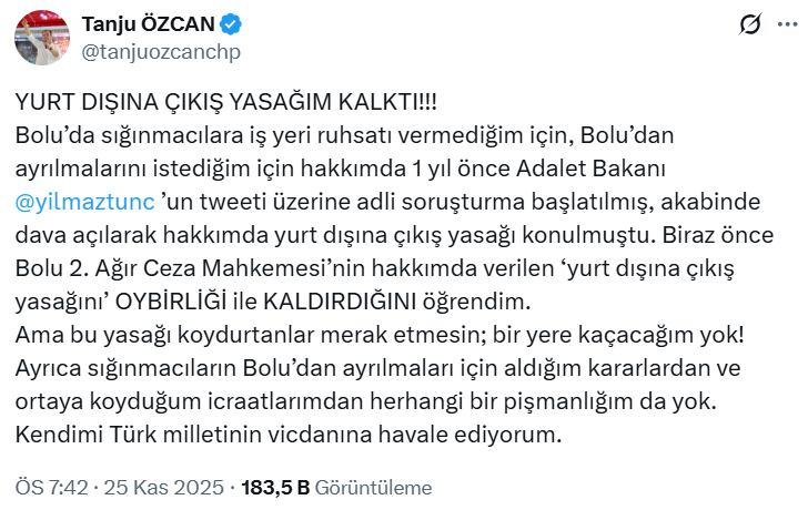 Kendisine yönelik açılan soruşturmayı ve verilen cezayı anımsatan Özcan, "Biraz önce Bolu 2. Ağır Ceza Mahkemesi’nin hakkımda verilen ‘yurt dışına çıkış yasağını’ oybirliğiyle ile kaldırıldığını öğrendim. Ama bu yasağı koydurtanlar merak etmesin; bir yere kaçacağım yok! Ayrıca sığınmacıların Bolu’dan ayrılmaları için aldığım kararlardan ve ortaya koyduğum icraatlarımdan herhangi bir pişmanlığım da yok. Kendimi Türk milletinin vicdanına havale ediyorum" ifadelerini kullandı.