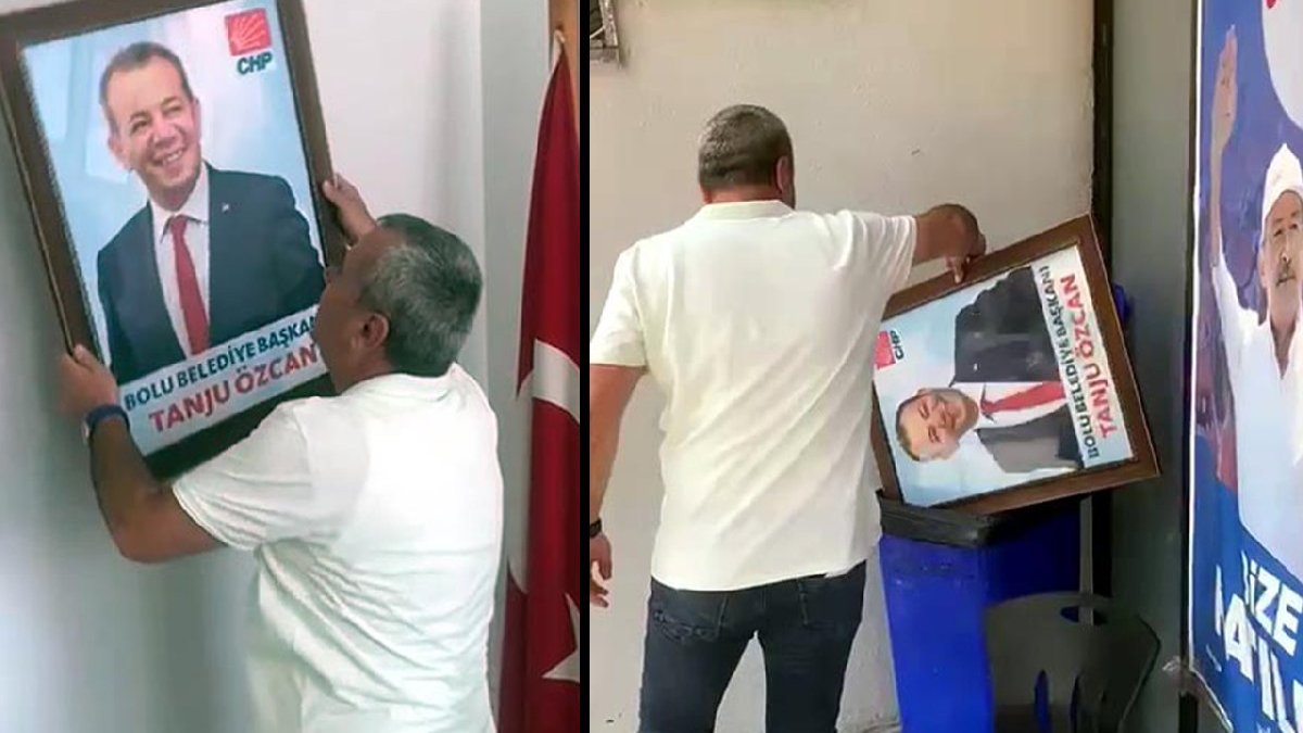 Bolu Belediye Başkanı Tanju Özcan'ın, CHP'den ihracı sonrası yaptığı itiraz başvurusunun Ankara 28'inci Asliye Hukuk Mahkemesi'nce reddedilmesi üzerine, CHP Bolu İl Başkanlığı binasında duvarda asılı halde bulunan çerçeve içindeki fotoğrafı kaldırıldı.