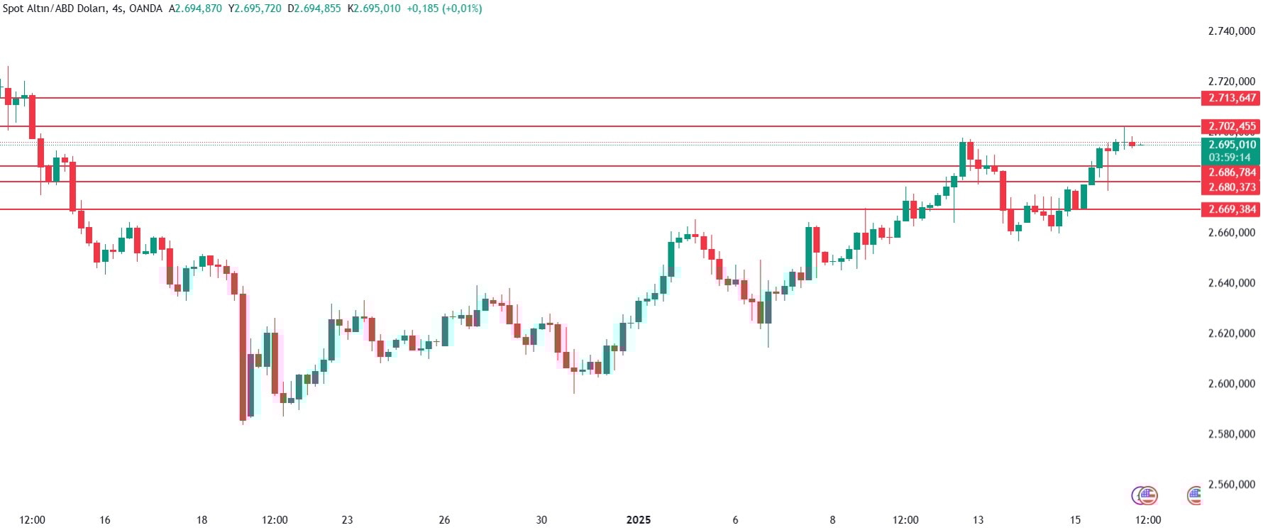 Dünü 2 bin 669 dolar ile 2 bin 02 dolar aralığında geçiren ons altın günü 2 bin 694 dolardan tamamladı. Yeni günde ise sabah seansında 09.05'te 2 bin 696 dolarda bulunuyor.