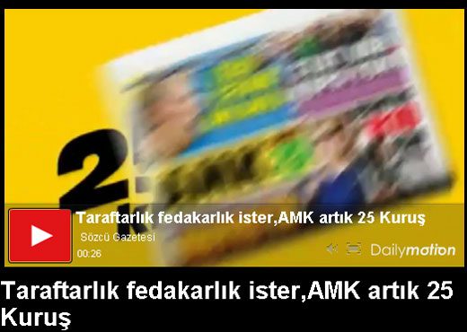 Taraftarlık fedakarlık ister… Bu sloganla yola çıktık, ve biz fedakarlık yapıp, Türkiye’nin en genç ve dinamik spor gazetesi AMK’nın fiyatını 50 Kuruş’tan 25 Kuruşa indirdik. Kısa sürede tüm sporseverlerin beğenisini kazanan AMK Gazetesi, 4 büyük takım için ayrı sayfaların yanısıra; 4 büyük boy sayfa At Yarışı Gazetesi, 8 büyük boy sayfa İddia Gazetesi ile birlikte sporseverin hizmetinde. Bugünden itibaren 3 gazete birden sadece 25 Kuruş. Sen de “Taraftarlık fedakarlık ister” diyorsan, bugün bir AMK Spor al, farkı gör.