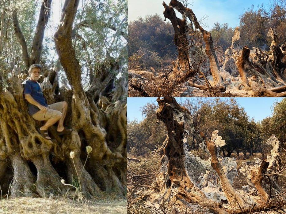 Aynı bölgede bulunan 1000 yaşının üzerinde onlarca antik zeytin ağacının da zarar gördüğü belirtildi. 2 bin 500 yıllık olan ve on kişinin kollarını açarak güçlükle etrafını çevirebildiği zeytin ağacının sahibi Apostolis Panagiotou, ağacın yanmadan önceki fotoğrafını ve yandıktan sonraki fotoğrafını kendisine ait sosyal medyadan paylaştı.