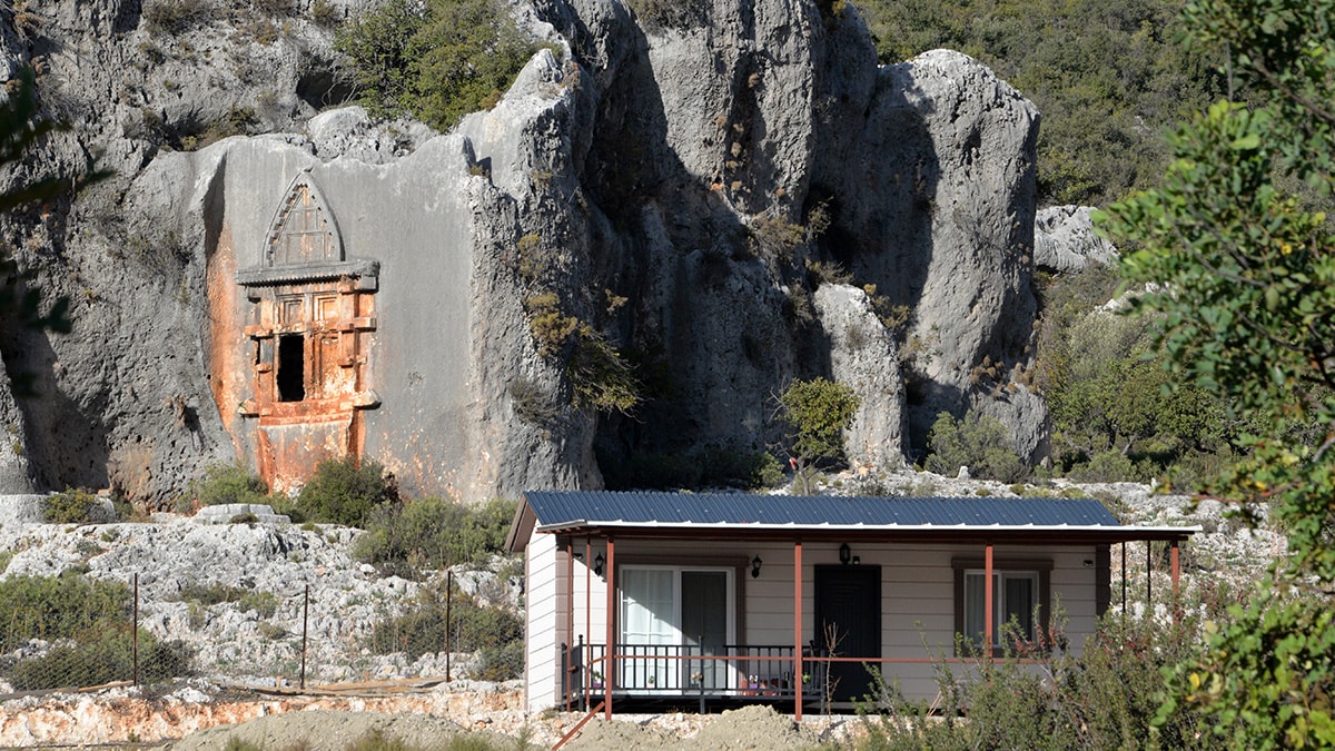 Antalya’nın Demre ilçesi, Çevreli Mahallesi’nde tahrip edilmiş haldeki bir kaya mezarının önüne ise prefabrik ev yapıldı.