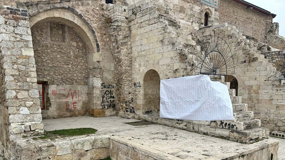 Sprey boya ile yazılan yazılar ise Vakıflar Bölge Müdürlüğü'nce branda ile kapatıldı. Yazıların kumlama tekniği ile silineceği belirtildi.