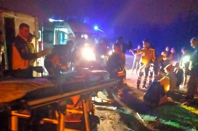 Kazada yaralanan 14 işçi, sağlık ekibinin ilk müdahalesinin ardından ambulanslarla hastaneye kaldırıldı. Polis, kazayla ilgili inceleme başlattı. (DHA)