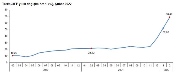Buna göre, Tarım-ÜFE 2022 Şubat'ta bir önceki aya göre yüzde 13,74, bir önceki yılın Aralık ayına göre yüzde 30,61, bir önceki yılın aynı ayına göre yüzde 68,49 ve on iki aylık ortalamalara göre yüzde 30,88 yükseldi.