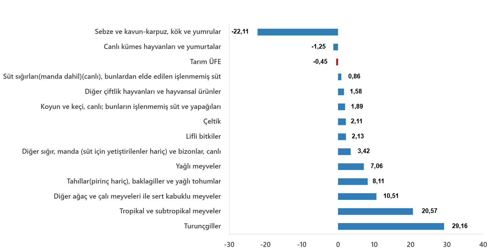 Ana gruplarda bir önceki aya göre tek yıllık (uzun ömürlü olmayan) bitkisel ürünlerde yüzde 8,33 düşerken, çok yıllık (uzun ömürlü) bitkisel ürünlerde yüzde 13,2, canlı hayvanlar ve hayvansal ürünlerde yüzde 1,54 artış kayıtlara geçti.