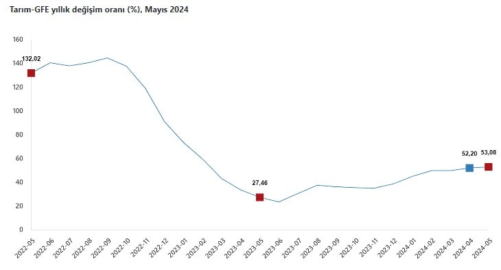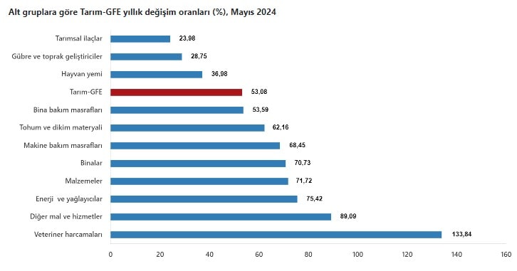 Tarımsal girdi fiyat endeksi (Tarım-GFE), 2024 yılı Mayıs ayında bir önceki aya göre yüzde 0,85, bir önceki yılın Aralık ayına göre yüzde 15,58, bir önceki yılın aynı ayına göre yüzde 53,08 ve on iki aylık ortalamalara göre yüzde 41,12 oranında arttı.