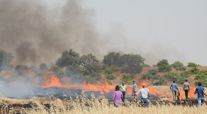 Nusaybin'e bağlı Açık Köyü'nde bugün öğleden sonra buğday etkili tarlalarla yangın çıktı. Rüzgarın da etkisiyle yayılan alevleri söndürmek için köy sakinleri adeta seferber oldu. Haber verdikleri itfaiye ekiplerinin gelmesini kadar köylüler, evlerinden aldıkları ceket, pantolon, kazma ve küreklerle alevlere müdahale etti. Köylüler büyük çaba göstermesine rağmen alevlerin yayılmasına engel olamadı. Alevlere Nusaybin itfaiye ekipleri de müdahale ederken, 500 dönüm ekili buğday alanı tamamen yandı. Köylüler büyük üzüntü yaşarken, yangınla ilgili soruşturma başlatıldı. (DHA)