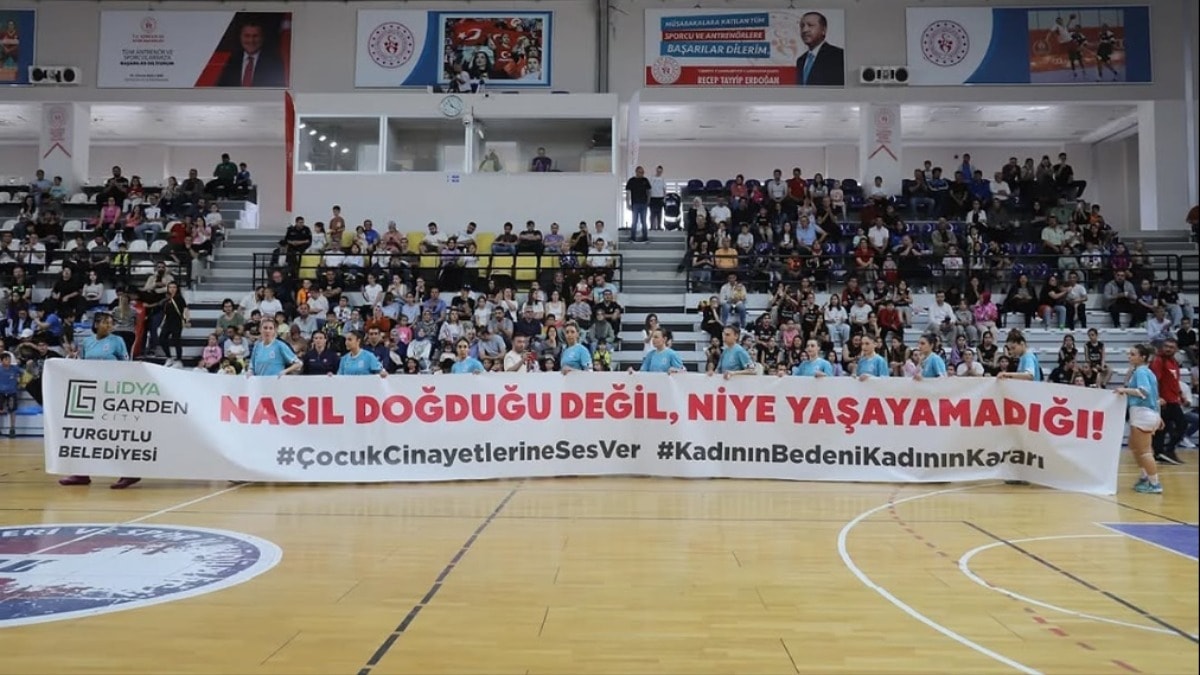 Türkiye Kadınlar Basketbol Ligi play-off çeyrek final eşlemelerinin ilk maçında Turgutlu Belediyespor Kırklareli Belediyesi Kırklareli Fen Bilimleri ile oynadığı karşılaşma öncesinde, “Nasıl doğduğu değil, niye yaşayamadığı. Çocuk cinayetlerine ses ver. Kadının bedeni kadının kararı” yazılı pankartla tribünlerdeki yerini aldı.