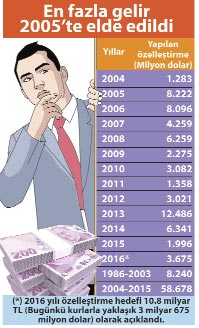 AKP hükümeti, 2004 yılından 2015 yılına kadar olan dönemde aralarında Türk Telekom, Tüpraş, Petkim, Erdemir gibi kurumların da olduğu yüzlerce kamu kurumunu özelleştirip 58 milyar 678 milyon dolar (yaklaşık 173 milyar TL) gelir elde etti. Bu yıl da özelleştirmeye barajlarla başlayan hükümet, Şanlıurfa HES, Tortum HES, Adıgüzel HES ve Kemer HES’in yanı sıra başta Milli Piyango olmak üzere kamu kurumları ile değerli arsaların satışından toplam 10.8 milyar lira civarında gelir elde etmeyi planlıyor.