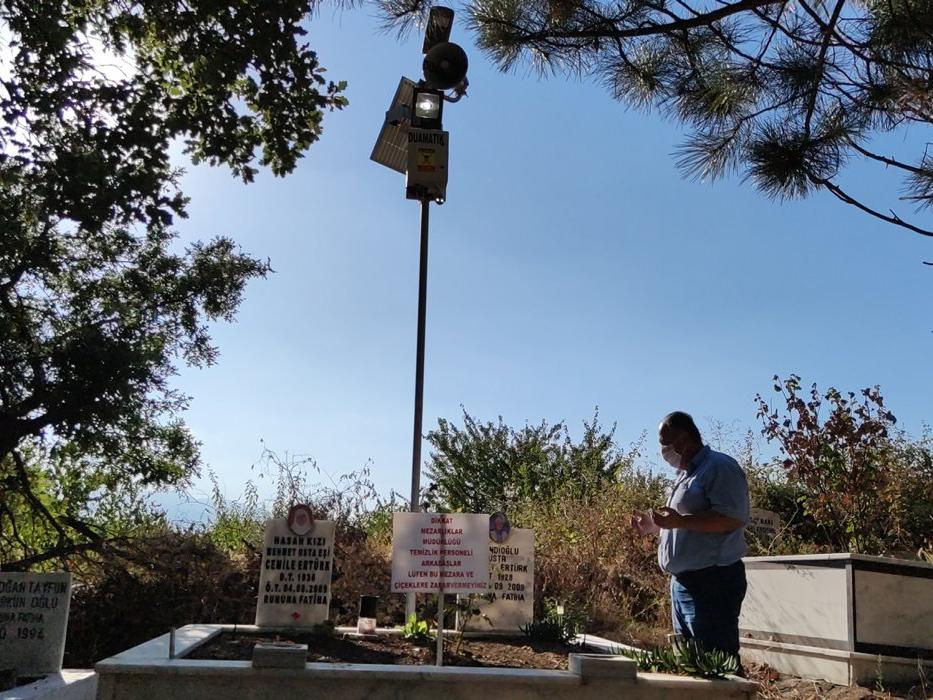 Foto: DHA / Tayfun Ertürk 22 gün arayla kaybettiği anne babasının mezarını sık sık ziyaret edemeyince duaMatik ismini verdiği sistemi kurdu.GÜNEŞ ENERJİSİYLE ÇALIŞIYOR