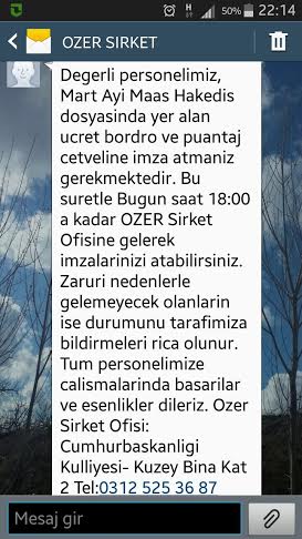 "Değerli personelimiz, Mart ayı maaş hakediş dosyasında yer alan ücret bordro ve puantaj cetveline imza atmanız gerekmektedir. Bu suretle bugün saat 18:00'a kadar Özer Şirket Ofisi’ne gelerek imzalarınızı atabilirsiniz. Zaruri nedenlerle gelemeyecek olanların ise durumunu tarafımıza bildirmeleri rica olunur. Tüm personelimize çalışmalarında başarılar ve esenlikler dileriz.