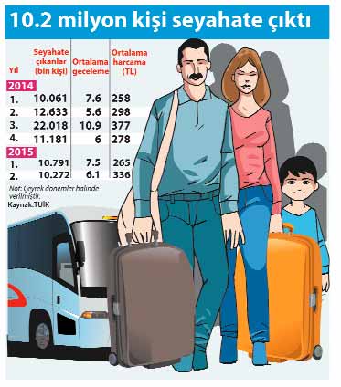 Türkiye İstatistik Kurumu verilerine göre, yılın ikinci çeyreğinde yurtiçinde ikamet eden 10 milyon 272 bin kişi seyahate çıktı. Seyahat edenlerin ortalama 6.1 gece tatilde kalırken, seyahat başına yapılan ortalama harcama ise 336 TL oldu. Burada, paket tur için yapılan harcamalar 4.9 milyar TL’ye ulaşırken, 367 milyon TL’lik kişisel harcama yapıldı.
